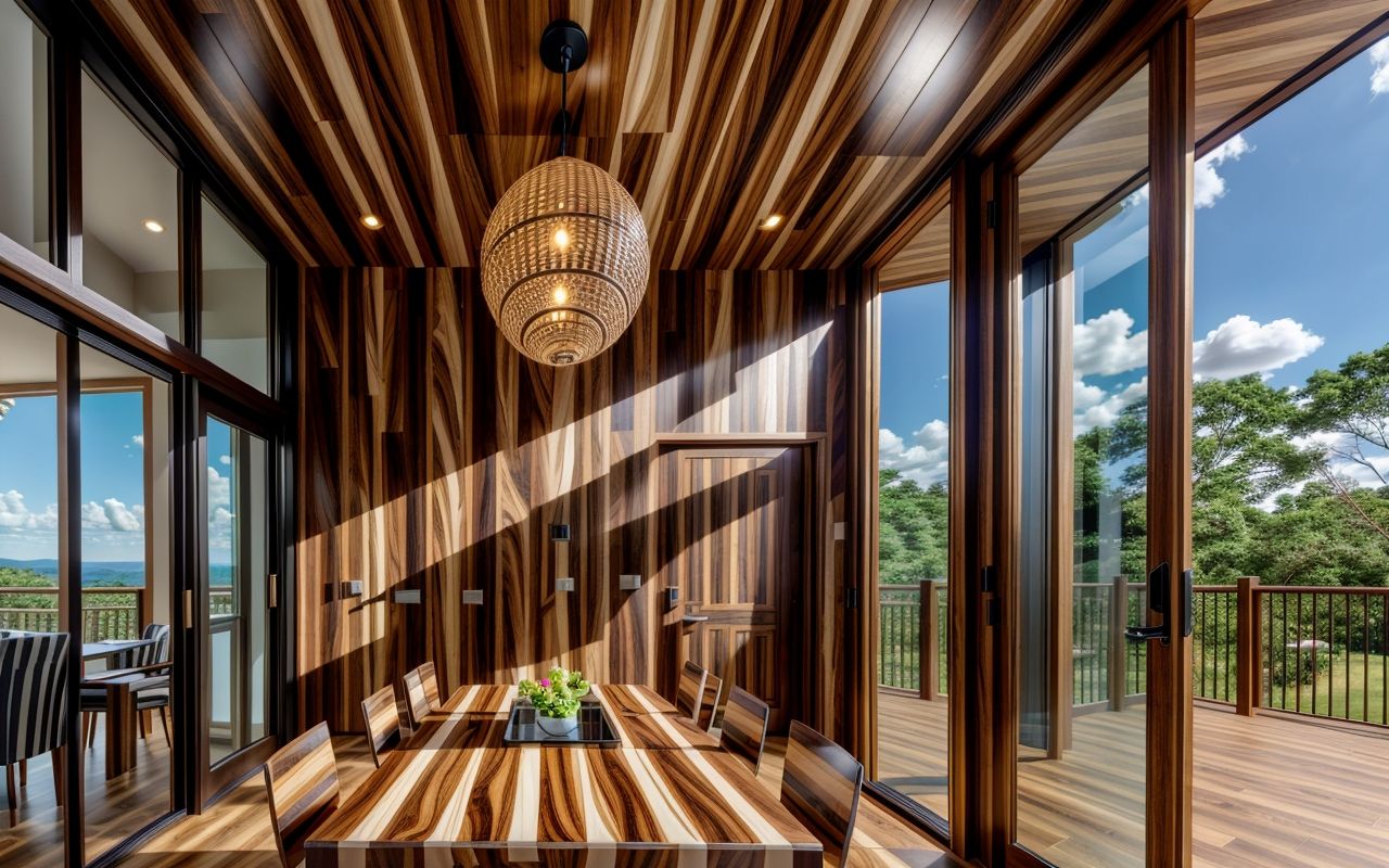 Зебрано отличается высокой прочностью и устойчивостью к износу, а также богатой эстетикой — его контрастные полосы делают изделия необычными и современными. Кроме того, его текстура хорошо гармонирует с разными стилями интерьера, что расширяет возможности дизайнерского оформления.